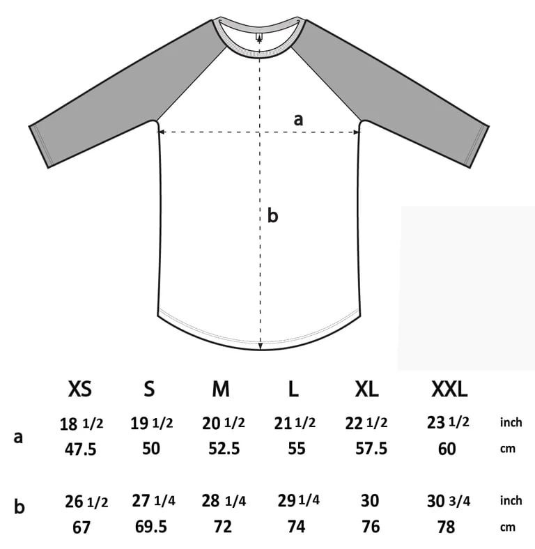 Printed Black on 3/4 Black sleeved, White bodied, bibbed bottom baseball shirts. As stock numbers fluctuate at supplier level, sizes may be capped.